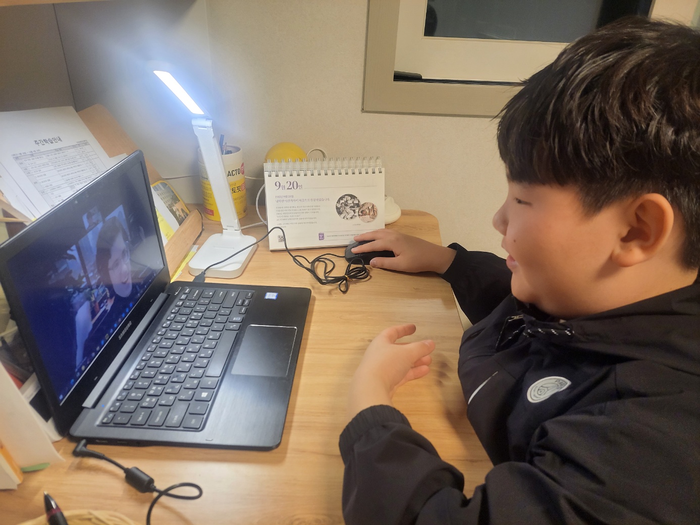 선생님과 즐겁게 수업하고 있습니다.